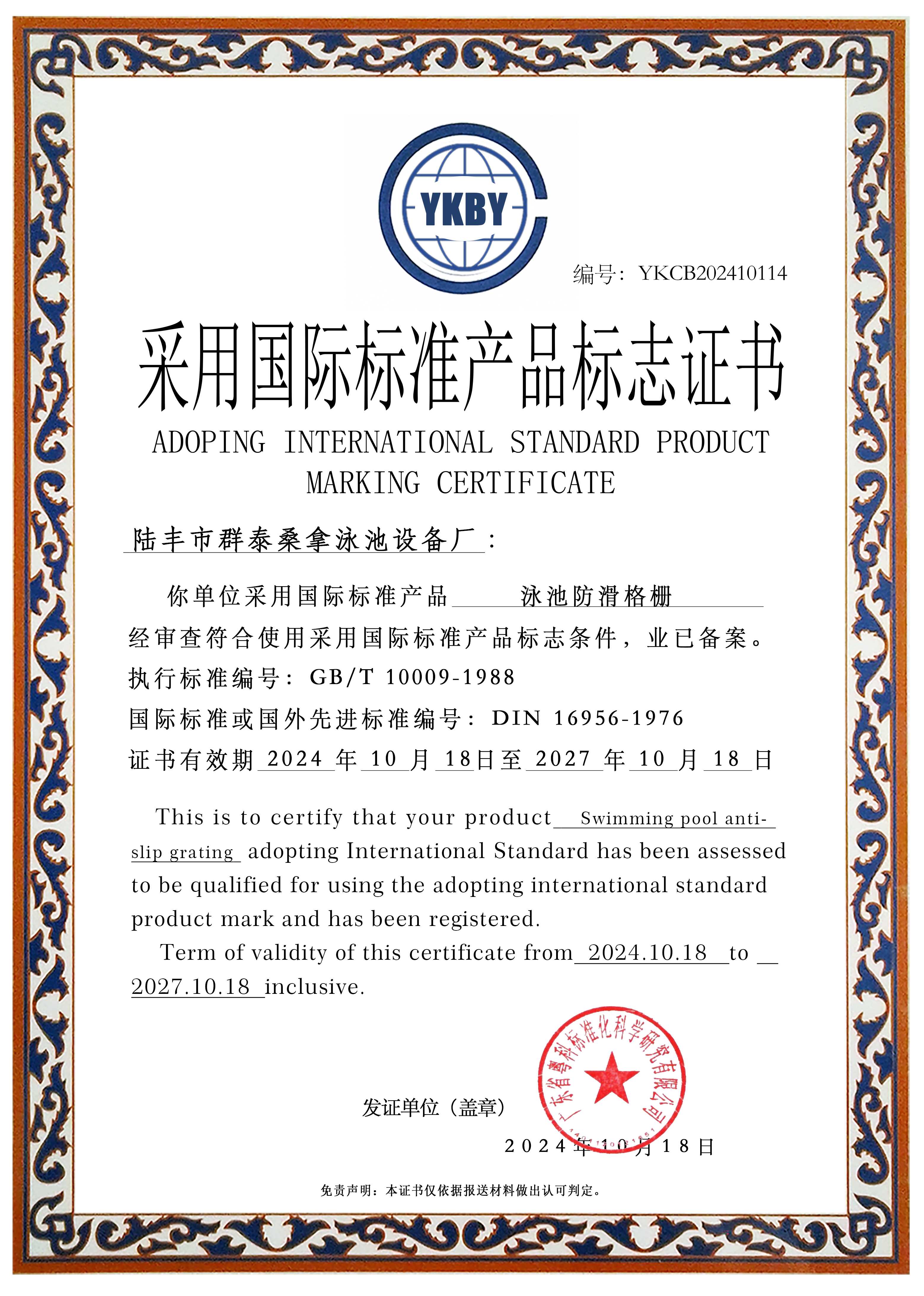 陆丰市群泰桑拿泳池设备厂采用国际标准认定公告