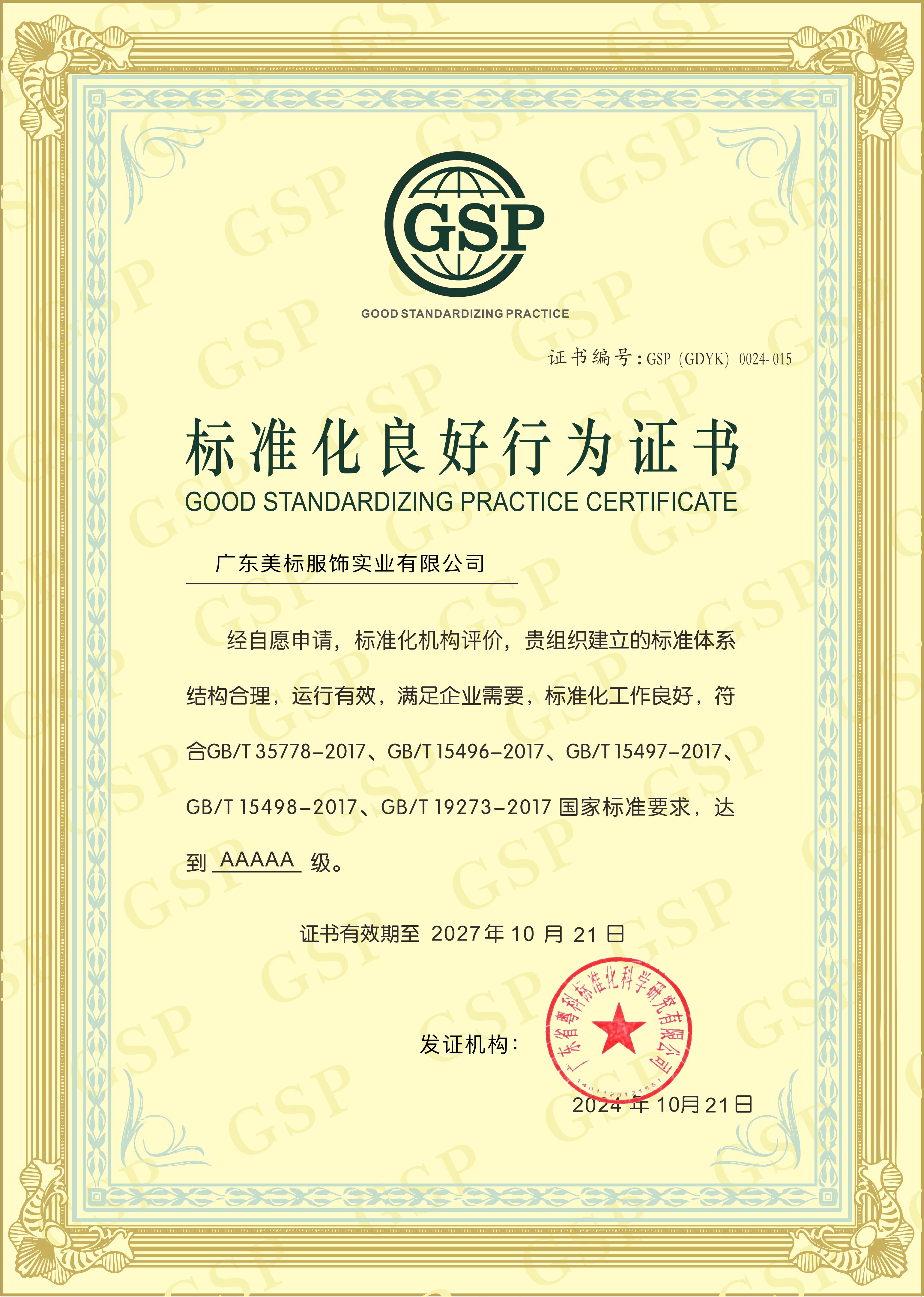 广东美标服饰实业有限公司标准化良好行为认定公告
