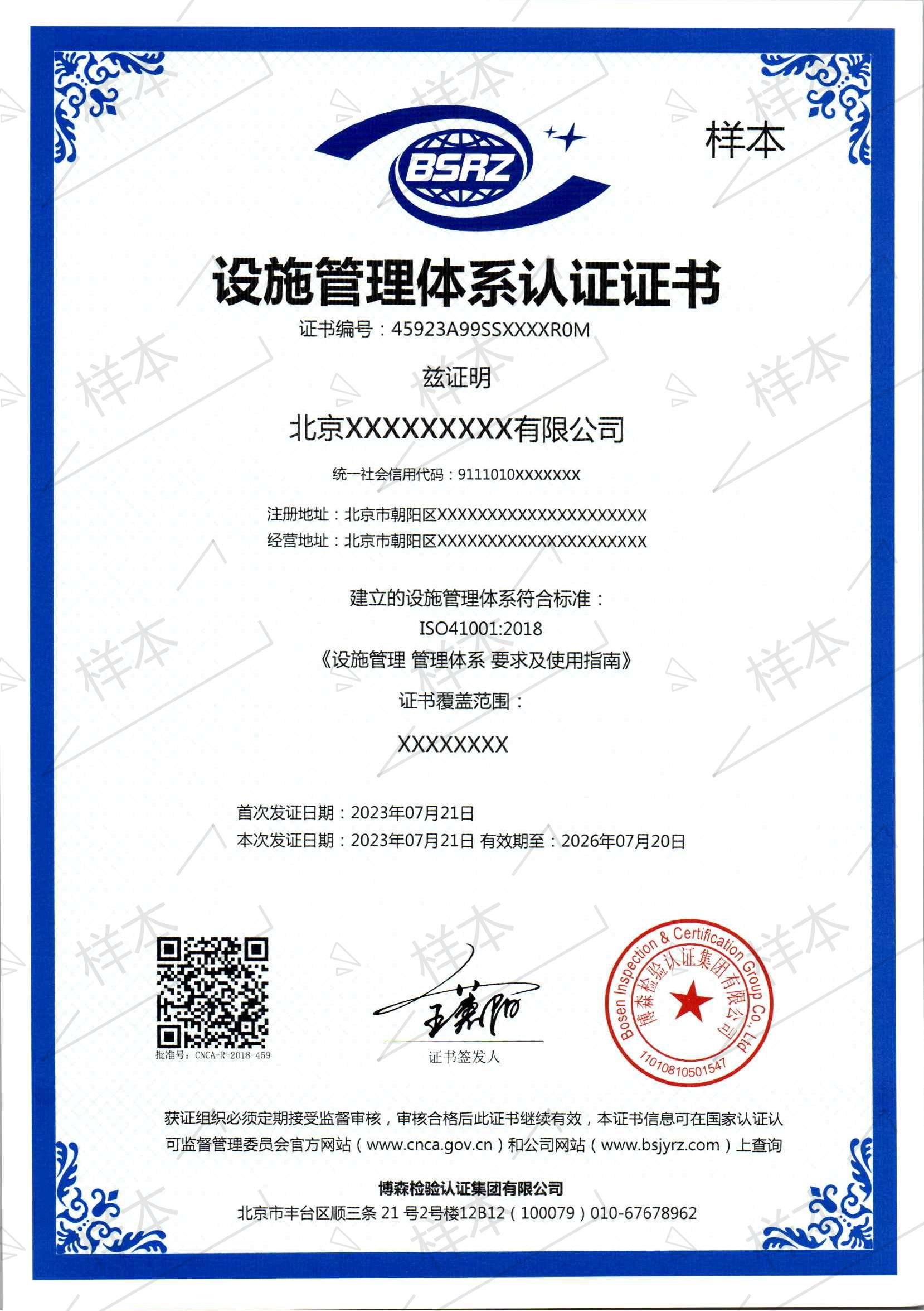 设施管理体系认证证书