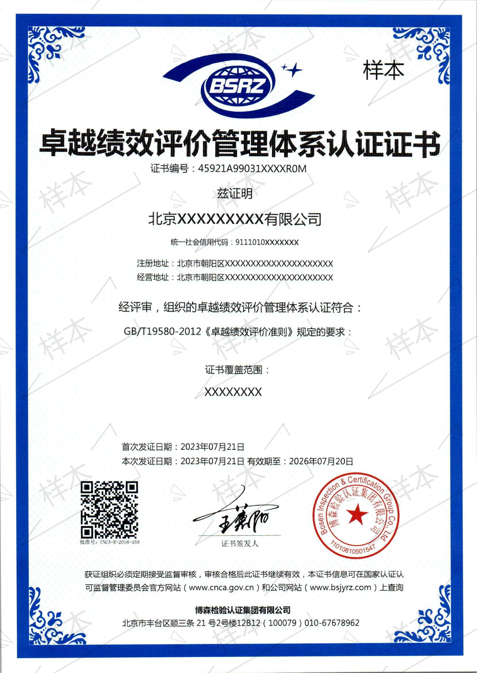 卓越绩效评价管理体系认证证书