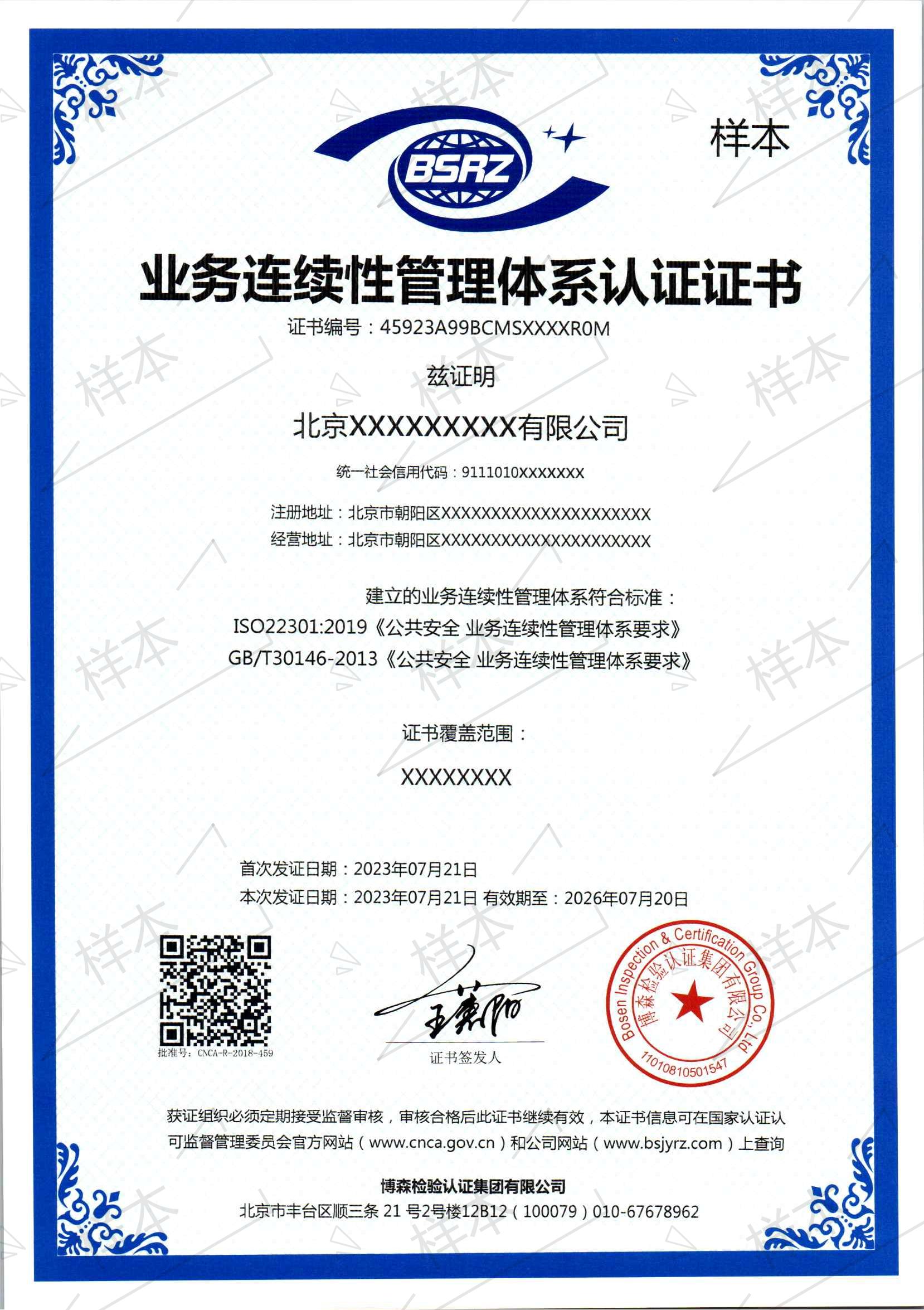 业务连续性管理体系认证证书