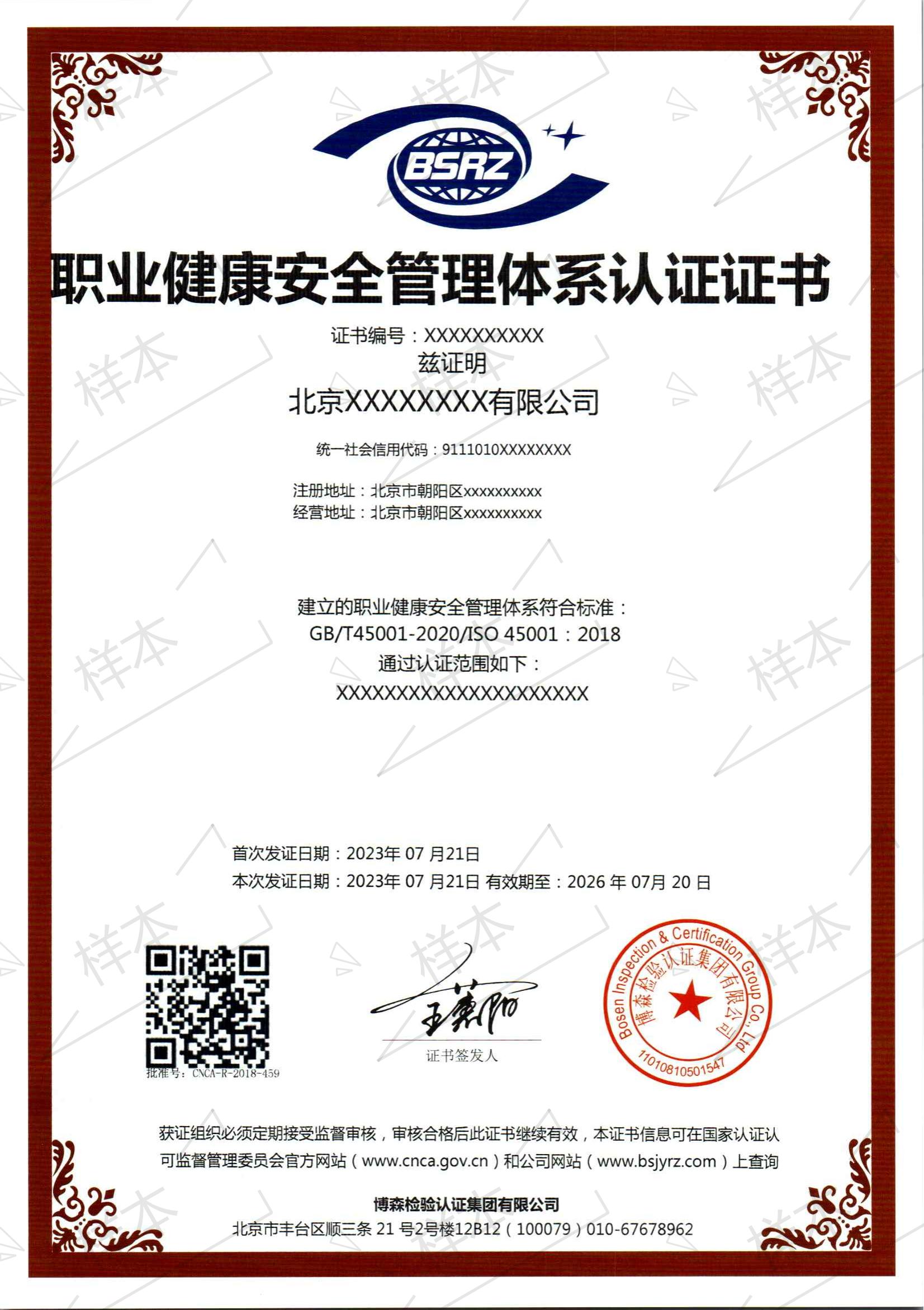 职业健康安全管理体系认证证书