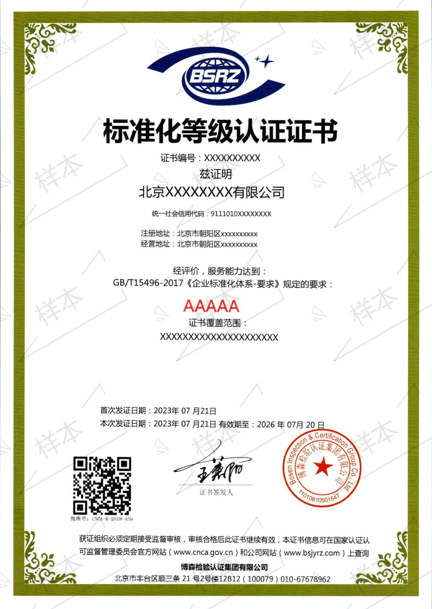 标准化等级认证证书