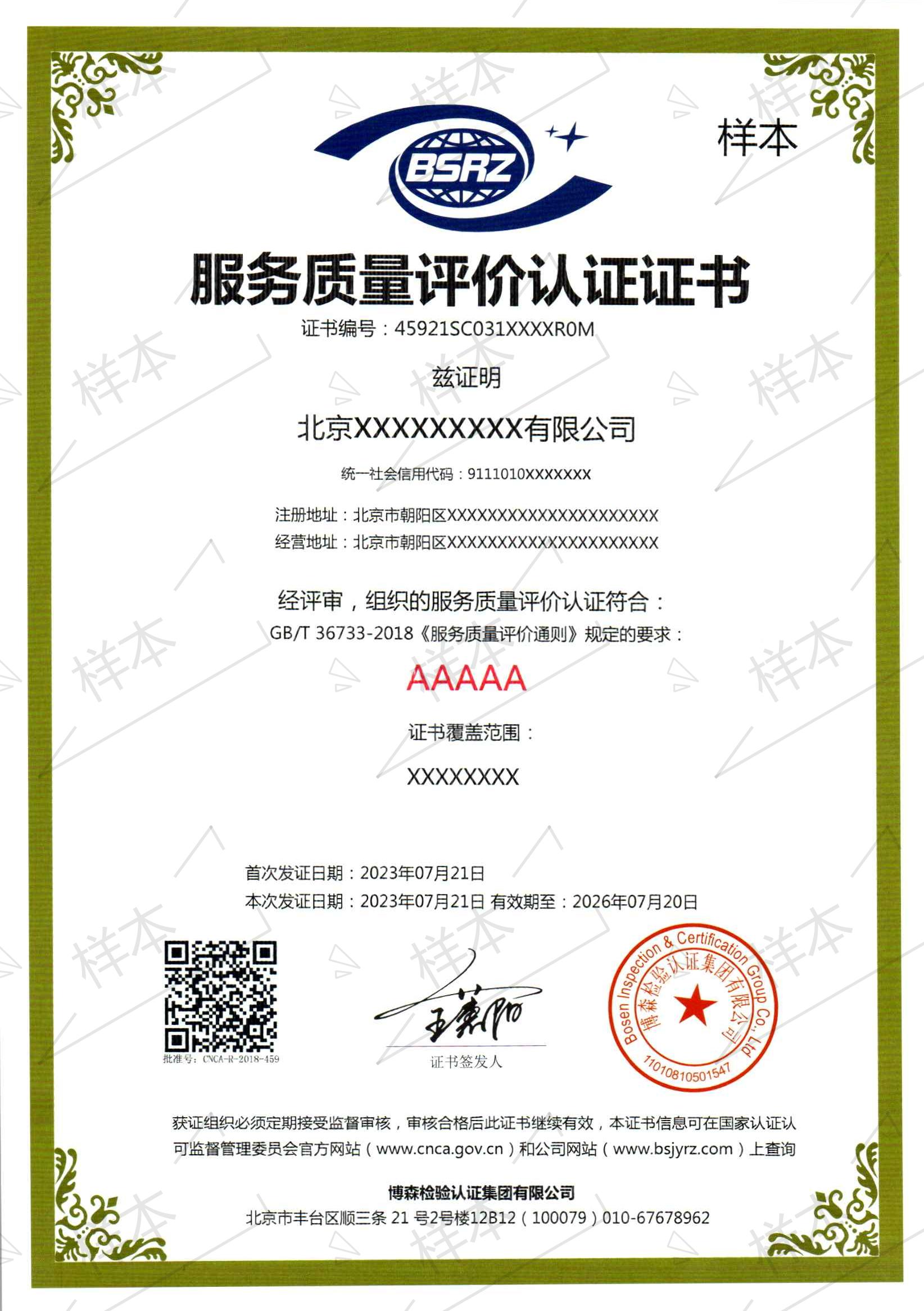 服务质量评价认证证书