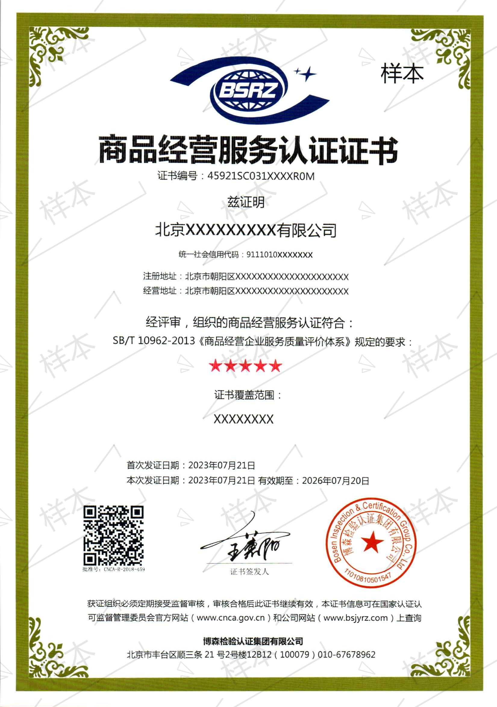 商品经营服务认证证书