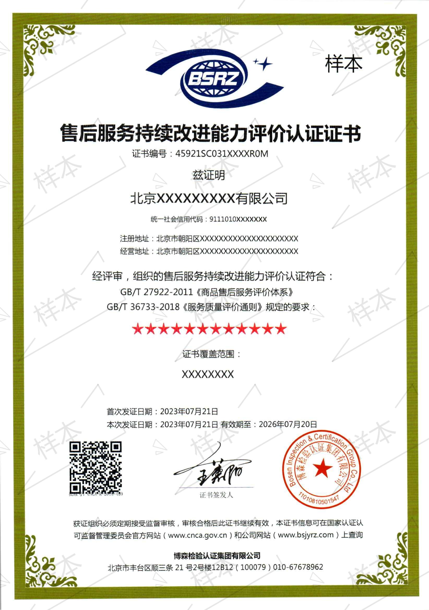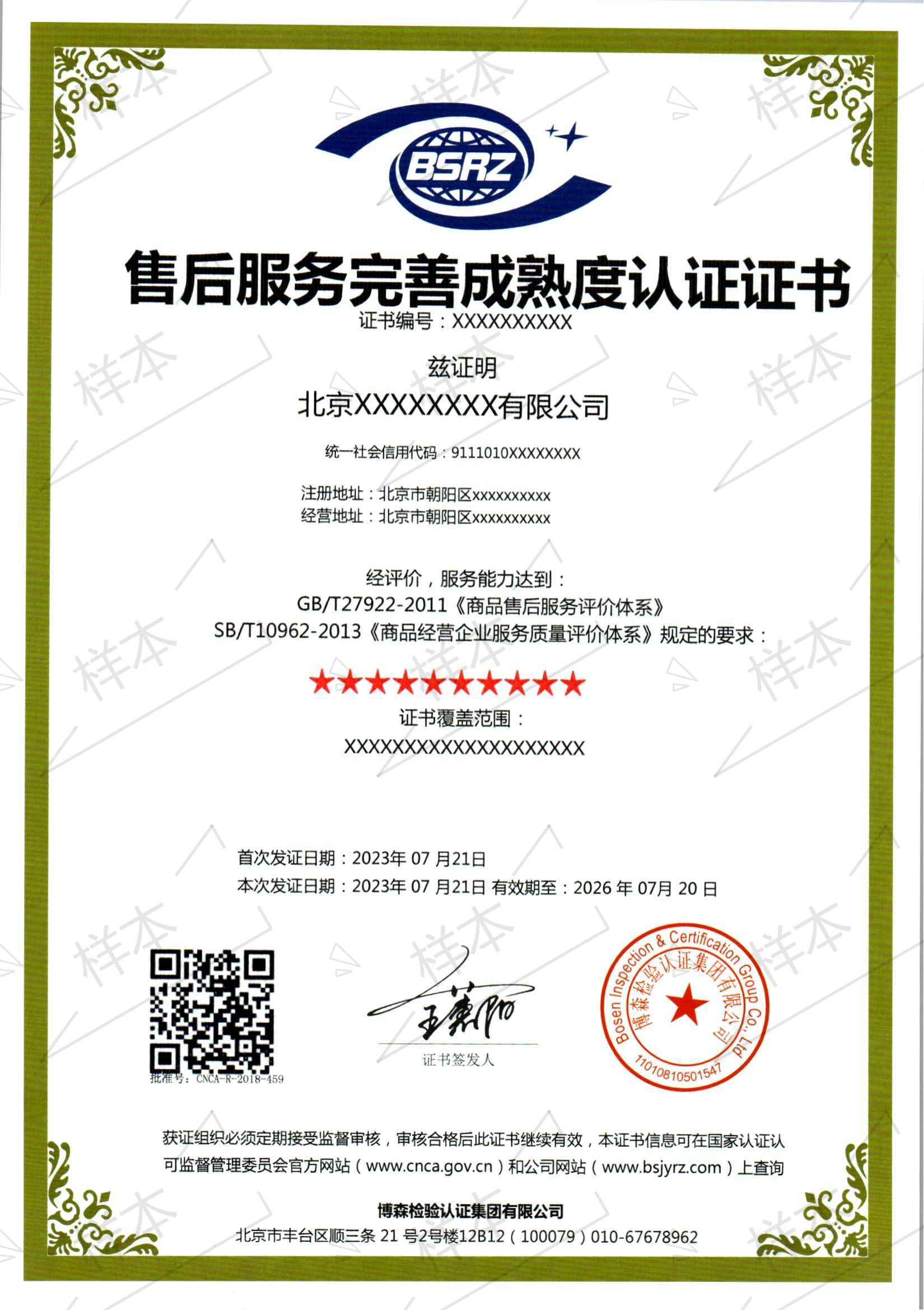 售后服务完善成熟度认证(七-十星级)证书