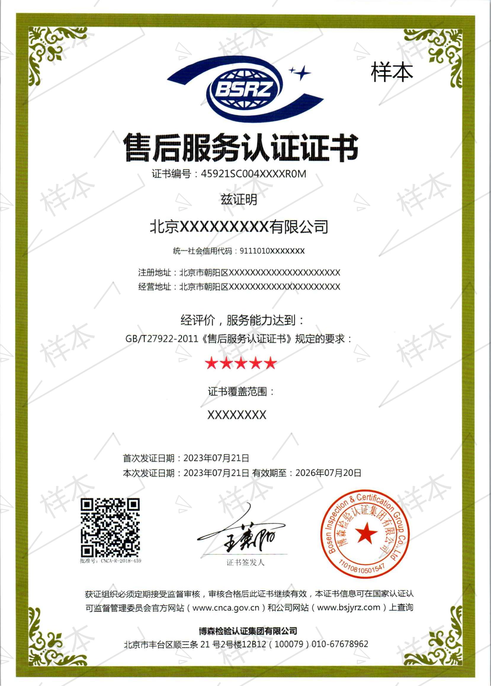 售后服务认证(五星级)证书