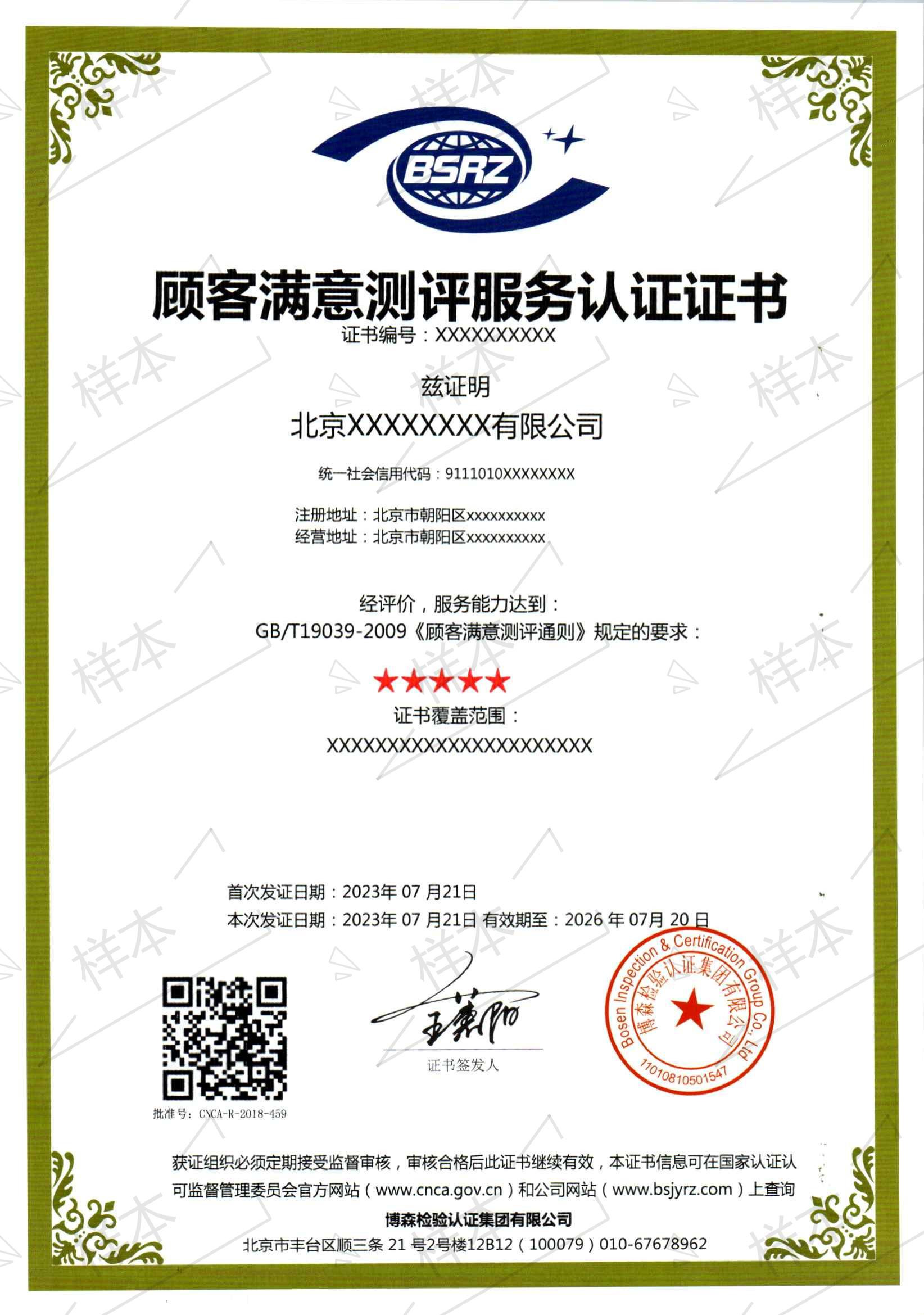顾客满意测评服务认证证书