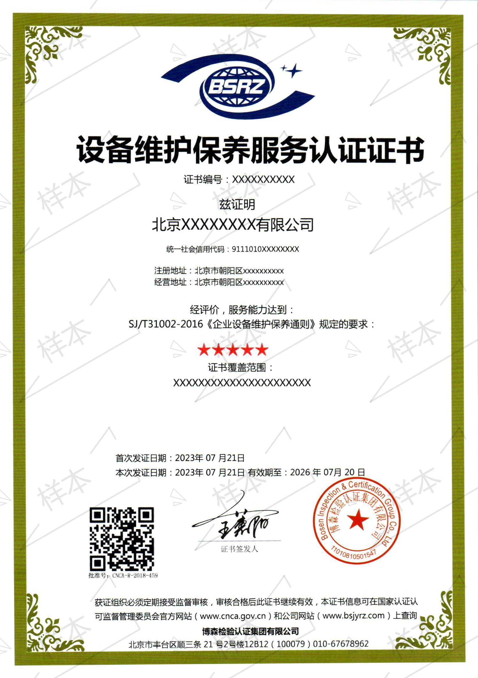 设备维护保养服务认证证书