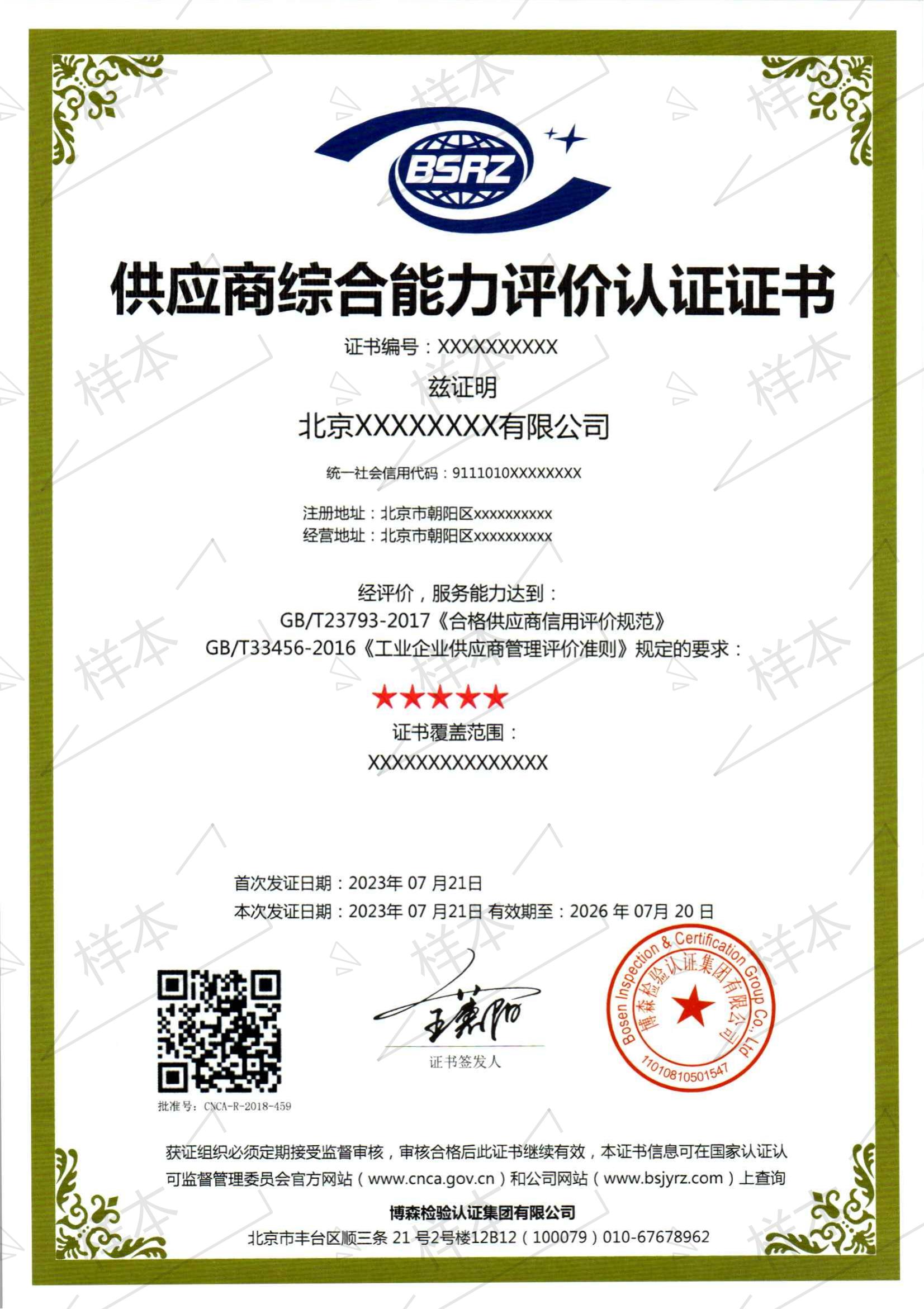 供应商综合能力评价认证证书