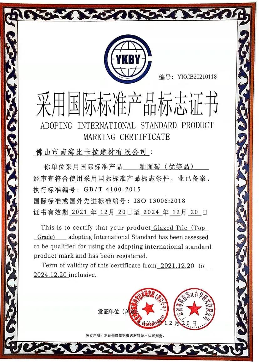 广东省粤科标准化科学研究有限公司和北京中科标准科学技术研究院共同组织专家对佛山市南海比卡拉建材有限公司提交的申报材料进行了审查,经审查确认《釉面砖(优等品)》采用生产的标准指标及产品检测报告符合ISO 13006:2018 标准要求,现予以认定,证书编号:YKCB20210118。