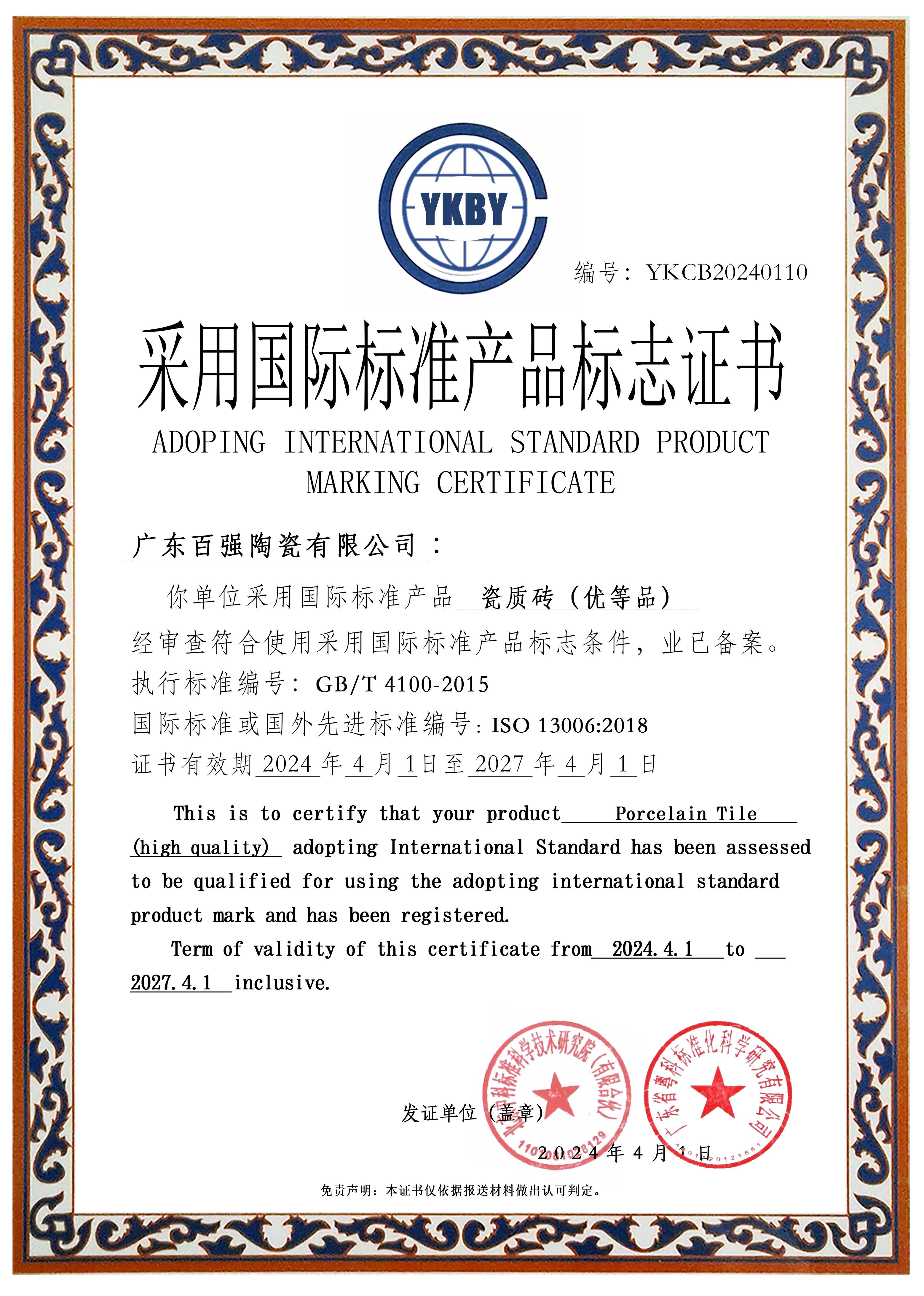 经审查确认《瓷质砖(优等品)》采用生产的标准指标及产品检测报告符合ISO 13006:2018 标准要求,现予以认定,证书编号:YKCB20240110。