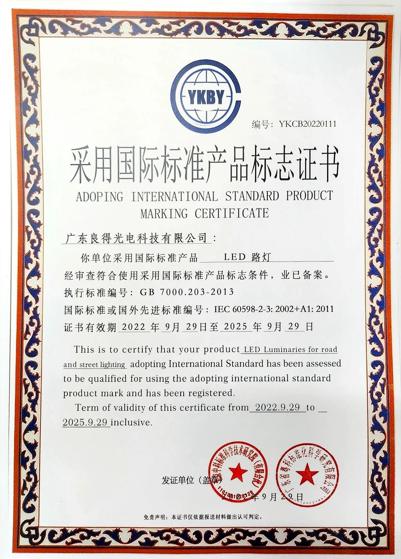 经审查确认《LED路灯》采用生产的标准指标及产品检测报告符合IEC 60598—2—3:2002+A1:2011 标准要求,现予以认定,证书编号:YKCB20220111。