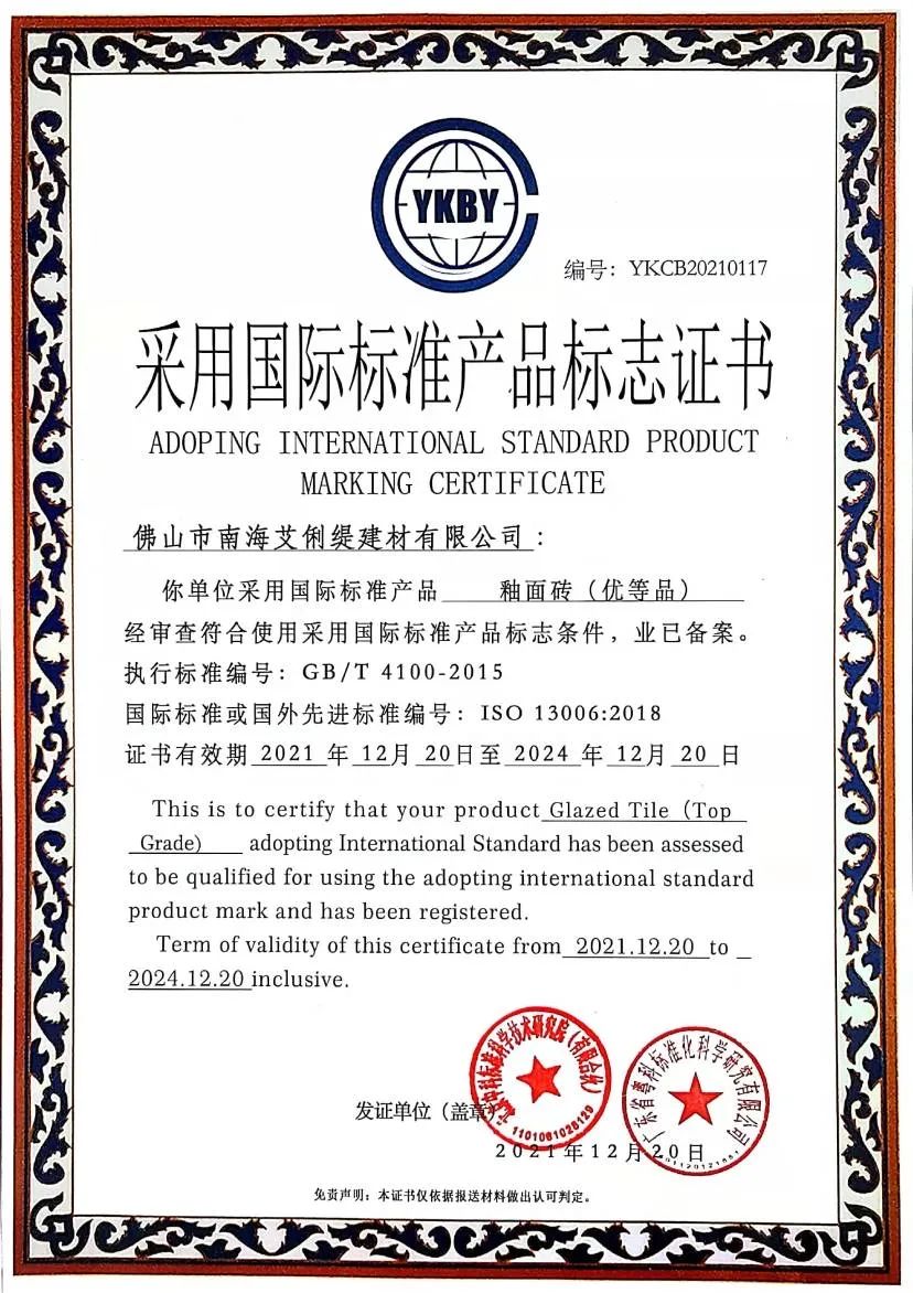 经审查确认佛山市南海艾俐缇建材有限公司《釉面砖(优等品)》采用生产的标准指标及产品检测报告符合ISO 13006:2018 标准要求,现予以认定,证书编号:YKCB20210117。