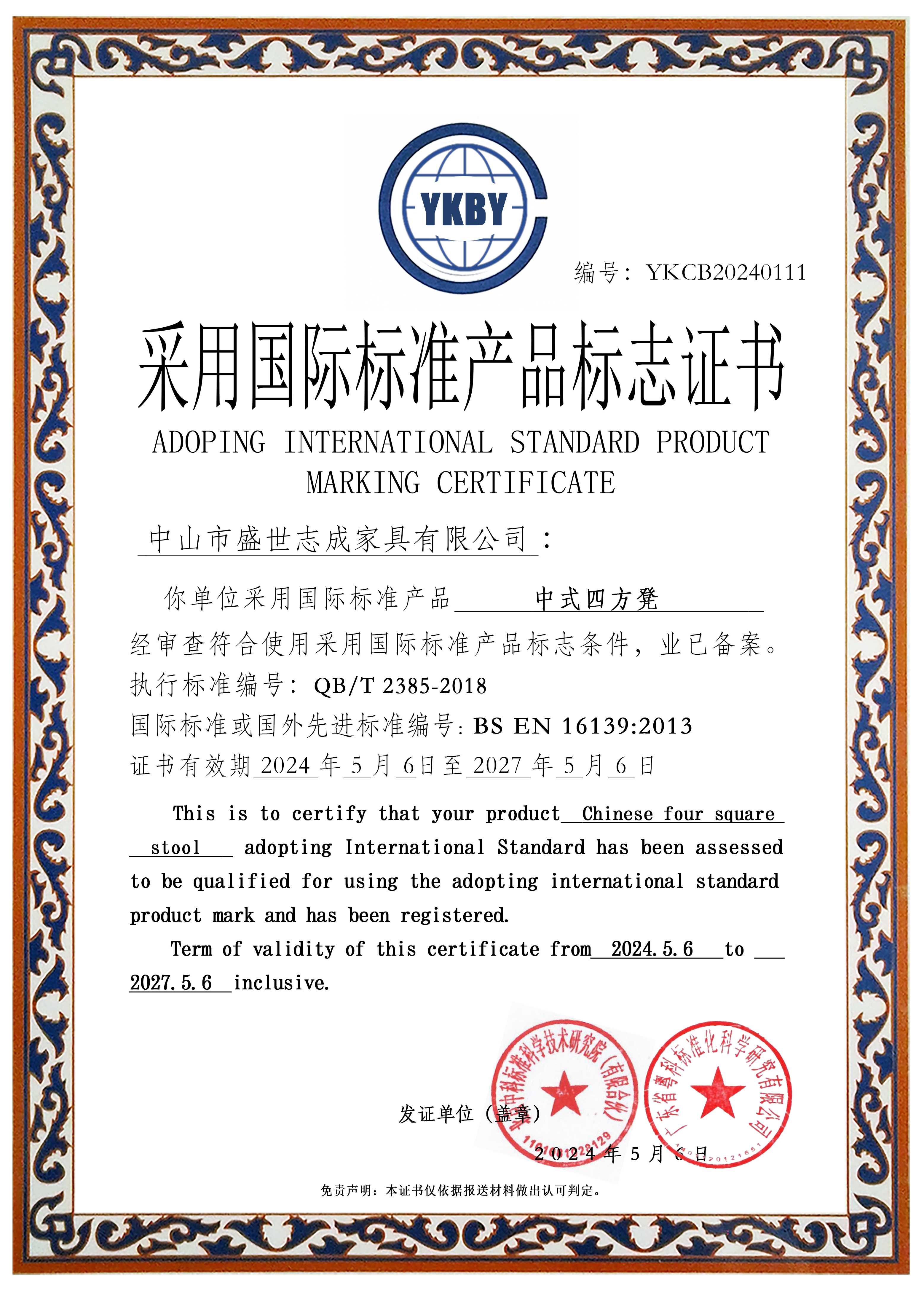 中山市盛世志成家具有限公司采用国际标准认定公告